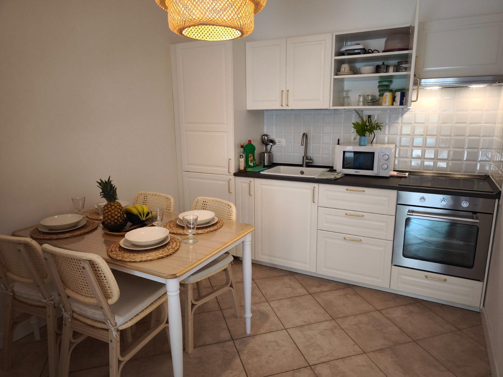 Cucina spaziosa completamente attrezzata: lavastoviglie, piastra ad induzione, macchina caffè a cialde, microonde. Divano letto e TV satellitare.
