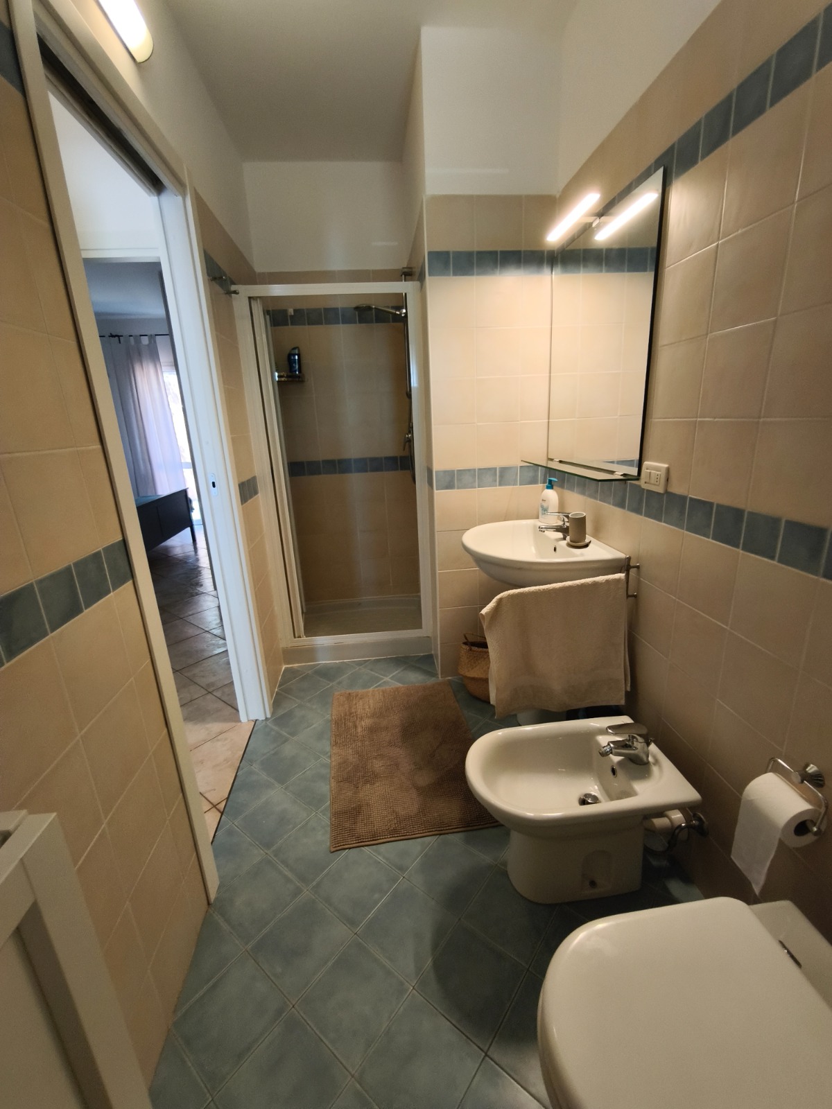 WC grande, spazioso e luminoso con piatto doccia grande, bidet, asciugacapelli.